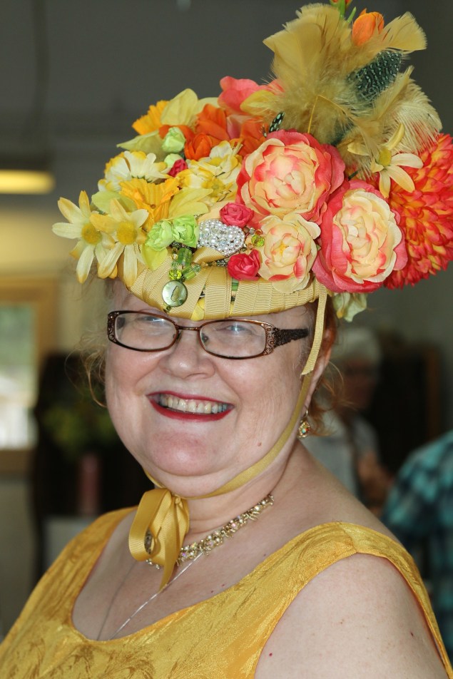 JoAnn Turner was stunning in her copy of an 1867 hat. She built it on a wire frame and all the flowers and feathers were from the Dollar Store. The perfect accessory for her traditional dress made from her Mom’s fabric. Bling from either Mom’s or Aunty’s jewelbox.