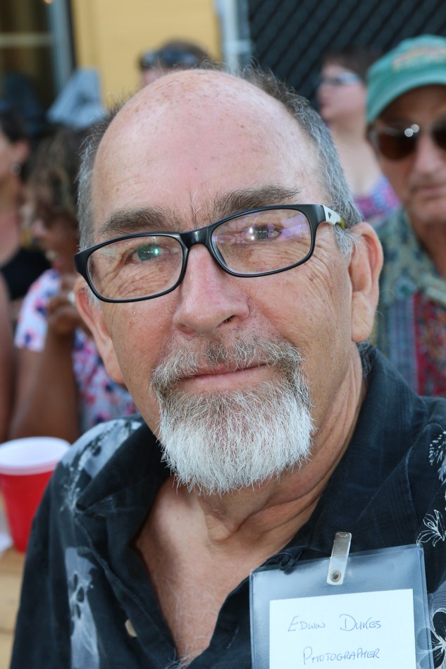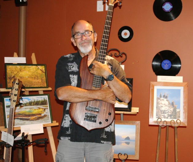 The feature Artist of the night was the amazing photog Ed Dukes. Ed knows the perfect accessory for his blue shirt with a hint of Hawaiian design – his hand made four string electric Bass Guitar. This is the latest guitar he has built. The body and neck are made from “Sapele” a large native tree to Tropical Africa and the fingerboard is made from African Ebony. The inlays are Walnut. This is Ed’s favourite guitar to play. Simply Beautiful!