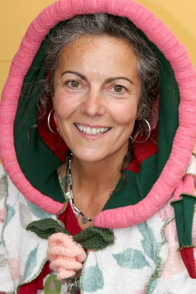 During some refreshing rain, Hélène put this beautiful little up cycled hooded sweater on. She looks – simply elegant!