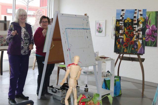 Sally Franks, feature artist, styling all in purple to match her show of spring Irises and Lorraine Horn, Aprils feature artist, having more fun that painting in the gallery. Do pop down and see them, every artist need an audience.