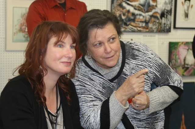 Feature Artist Dawn conferring with April Feature Artist Lorraine deep in conversation, I wonder what colour they are talking about?