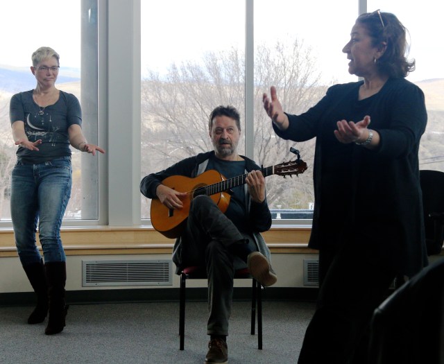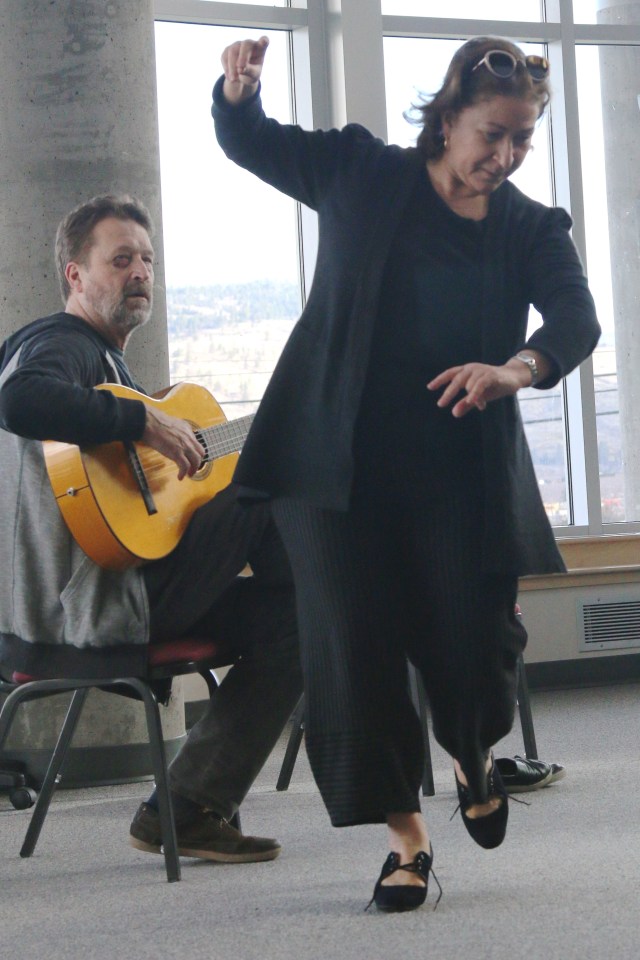 Flamenco Rosario Ancer and husband Victor Kolstee, Guitarist, took some time to explain the history and some of the technical aspects of Flamenco, the very expressive Spanish dance style, to a full audience in the lobby of the Frank Venables Theatre! Dancer Andrea got a few pointers!