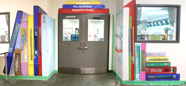 The students at Tuc-el-nuit Elementary have been helping me paint a mural of books at the entrance to the Pat McGibbon Memorial Library.