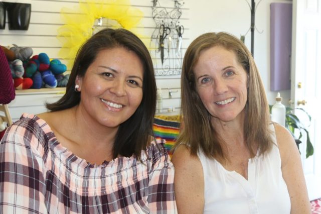 Paula, owner of Baaad Anna’s, points out some differences in the yarns to Brenda, her upcycled garments are available at Maker Place.