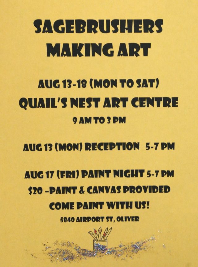 The Sagebrushes are a painting group of all abilities, they get together to share ideas and techniques. They self teach as well as have outside artists in for workshops. They meet from September to June at the Quails Nest on Airport Rd. For info connect with Sally at sagebrushsal@hotmail.com