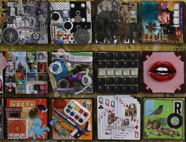 Robin Bells “Block Letters” a mixed media of found objects, representing the letters of the alphabet, collaged onto tiny canvases, then mounted on a yellow background of letters and textures to create this fabulous piece for any home.